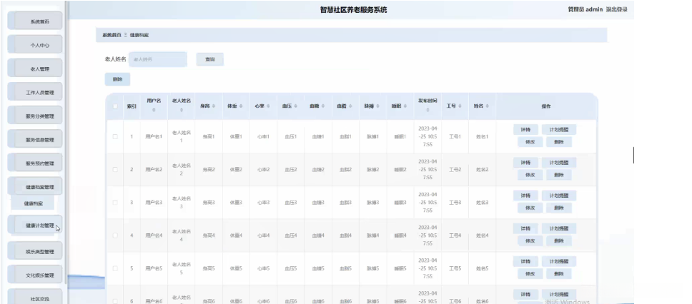 系统管理员通过点击"健康档案管理"按钮发起操作。系统管理员在页面中输入用户的姓名信息后完成查询和删除等基本操作;随后根据具体需求完成详情查看、计划提醒设置以及信息修改或删除等操作;如图5-12所示: