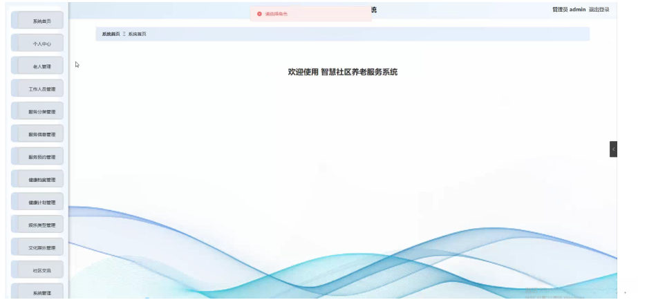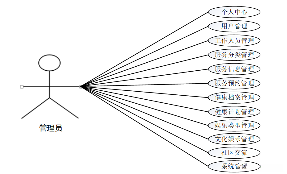 管理员负责管理和维护以下核心功能:涵盖个人中心、用户管理和工作人员管理等多个模块;同时包括服务分类管理和服务信息管理系统两大类别的相关内容;此外还有服务预约管理和健康档案/计划管理系统等实用模块;最后还有涉及社区交流与文化娱乐的特色功能模块以及系统整体配置的系统性功能模块。
