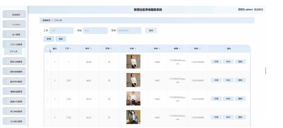 管理员点击进入“工作人员管理”界面,在“工作人员管理”界面中输入员工编号、姓名以及性别选项后,即可实现员工查询、新增及删除操作,并根据需求对员工详细信息进行查看、修改或删除操作;如图5-9所示。