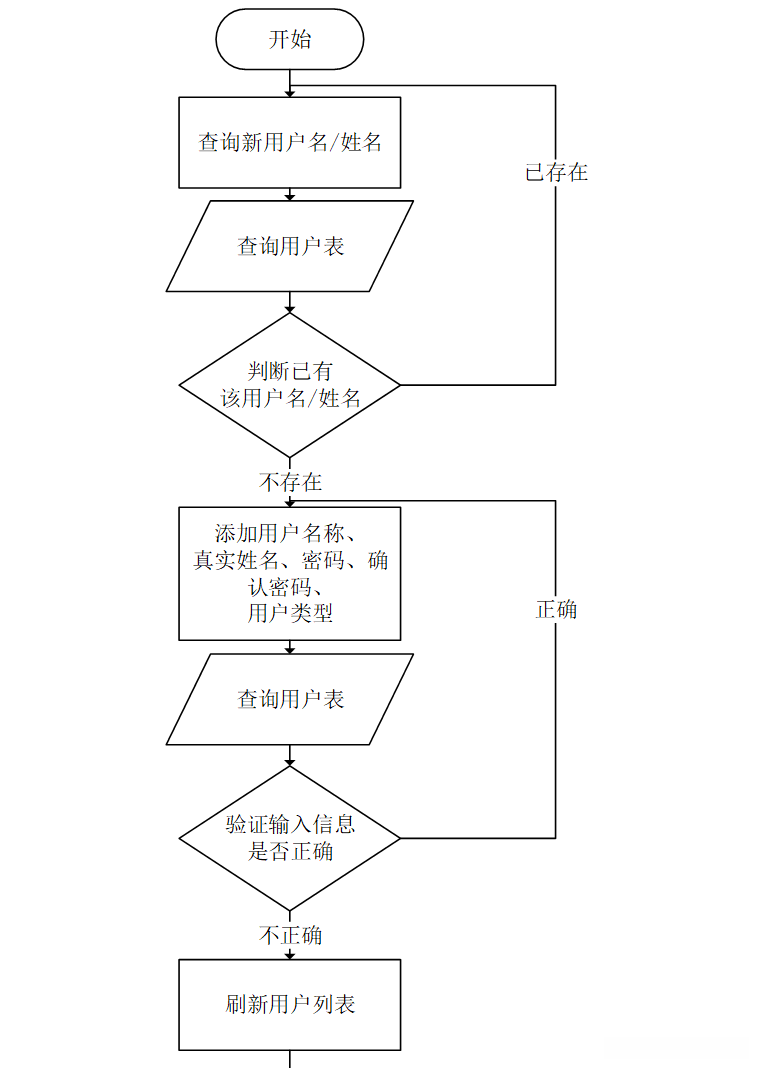 流程首先是查询新增用户名是否存在。若已有相同用户名,则需重新指定新的用户名,并同步提供其他相关信息。在将新增用户录入数据库之前会核实相关信息的完整性。当所有提供的资料均为真实且完整的,则系统将显示更新后的用户列表;若有遗漏或错误的信息则会引导回相应步骤进行更正。这一过程可通过图3-5进行详细说明。