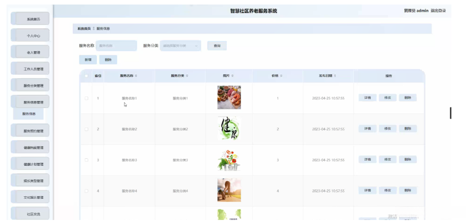 管理员单击服务信息管理功能项。打开服务信息页面后,在输入栏中键入服务名称并选择分类类型;随后进行查询、新增或删除操作。根据需要对详细信息执行查看、修改或删除操作;如图5-10所示:
