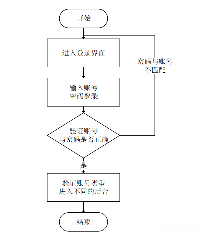该系统的首项操作是登录流程,在这一阶段中首先需要完成的是用户的账号及个人密码的录入过程。随后系统将对录入的账号信息及个人密码进行验证。当验证通过后(当验证通过后),系统将根据用户身份分类进入对应的服务模块(根据用户身份分类进入对应的服务模块)。若验证失败,则需返回至初始登录界面重新操作(若验证失败,则需返回至初始登录界面重新操作)。整个过程可通过图3-4进行详细说明(该流程如图3-4所示)。
