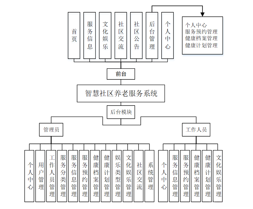 智慧社区养老服务系统的综合网络空间开发设计旨在实现传统管理向网上管理的转变。其目标在于将传统的管理模式转变为网上管理模式,并确保智慧社区养老服务管理具备便捷高效的特点,并建立安全可靠的交易机制。明确的目标定位下,“该系统可将其功能模块划分为管理员模块、工作人员模块以及用户模块。”