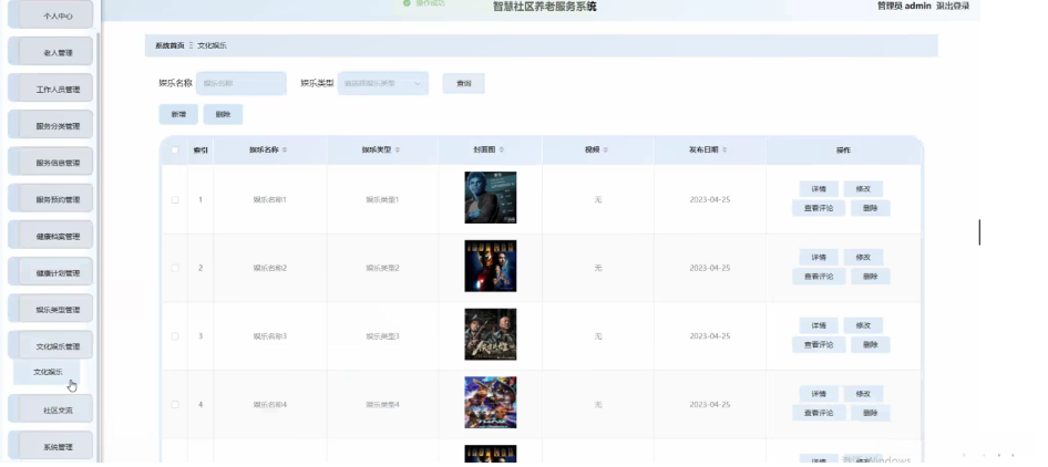 管理员通过点击"文化娱乐管理"按钮启动相关操作。进入文化娱乐页面后会要求录入娱乐名称及选择其所属的类型以便进行查询、新增或删除文化活动列表;根据具体需求对录入的信息可执行详情查看、评论浏览以及修改或删除功能。