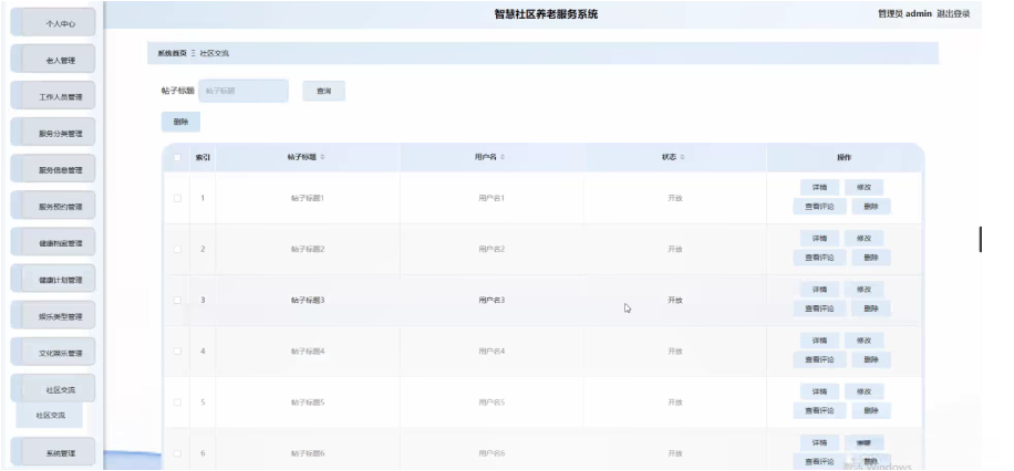 系统管理员点击进入社区交流管理界面。在页面中输入帖子标题后进行内容查询与列表清理;根据需要对社区交流详细信息执行查看详细信息、编辑内容以及删除信息的具体操作;如图5-15所示。