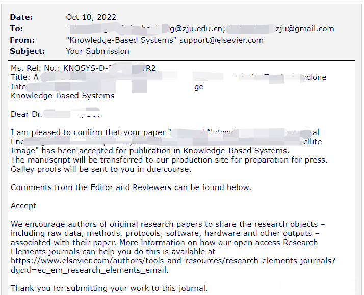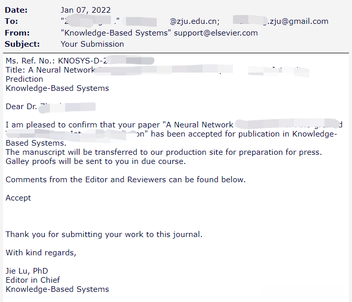 Knowledge-based Systems (KBS) is a top-tier journal in computer science and artificial intelligence. This paper was submitted on October 10, 2021, and accepted on January 7, 2022, taking about three months. The submission process included multiple revisions and required reviews completed several times before acceptance.