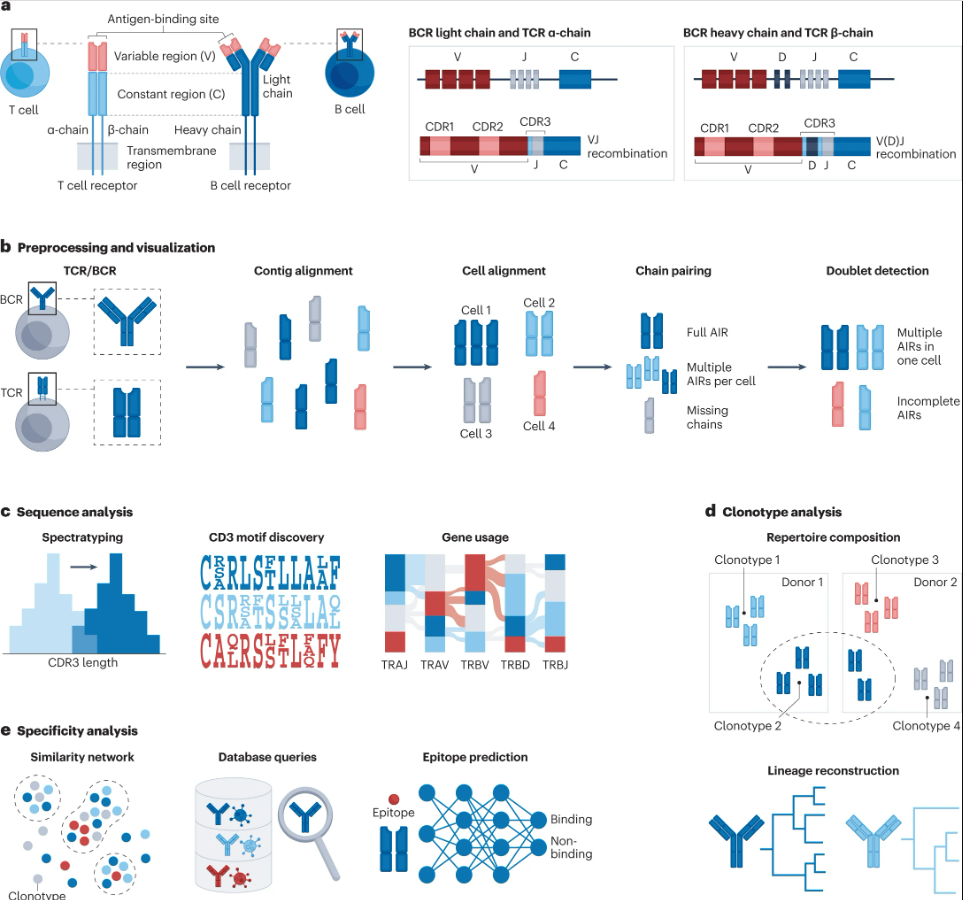 商用10x Chromium单细胞免疫分析和BD Rhapsody TCR/BCR 多组学分析能够生成配对的转录组学和AIRR数据。可以使用 scirpy、Dandelion 或scRepertoire 等流程进行免疫受体分析,包括解码AIRR序列特征、筛选功能性适应性免疫受体、克隆型的鉴定和分类、确定细胞特异性、将适应性免疫受体与转录组学测量相结合等。
