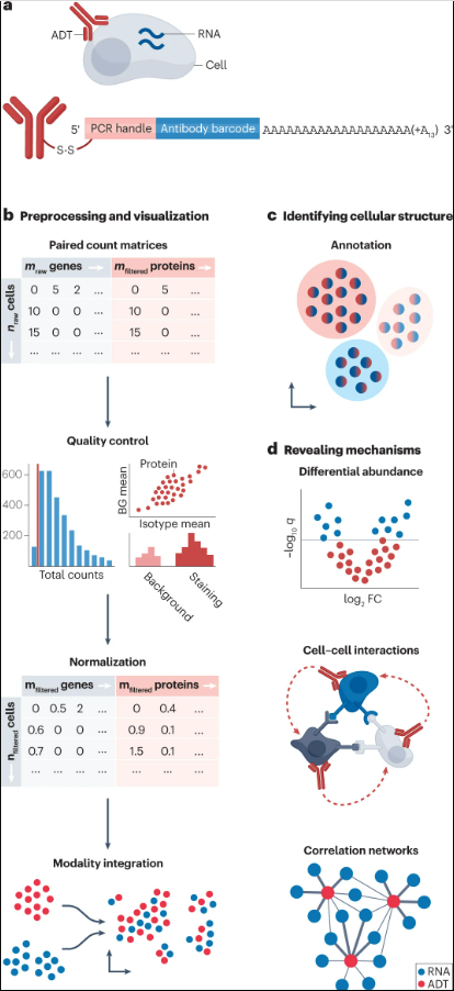 在各自的预处理之后,可以使用通常适用的多模态集成工具或CITE-seq特定的、基于深度学习的totalVI 来获得联合嵌入,该工具学习成对测量的联合概率表示,该联合概率表示也考虑了噪声和技术偏差,包括每个模态的批处理效应。另一种方法是使用CiteFuse ,它使用CLR对ADT进行归一化,并将两种模态矩阵与相似性网络融合算法相结合。然后,可以使用Leiden对联合嵌入进行聚类,并通过将聚类与所有其他聚类进行比较,使用Wilcoxon秩和检验基于差异表达的RNA和ADT进行注释。这两种模态都可用于下游任务,如研究细胞-细胞通信,其中考虑配体簇的RNA表达和受体簇的蛋白质表达,或使用CiteFuse进行RNA和ADT相关性分析。