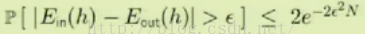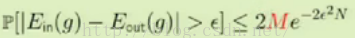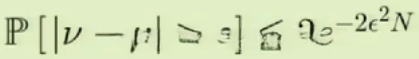 在本研究中所涉及的变量中,nu代表频率参数;mu代表概率分布;epsilon作为这两个概念之间的误差指标;N则表示取样的总次数。通过分析该公式可知,在数据量较大的情况下(即N较大时),频率估计值与真实概率之间的接近程度逐渐增强;然而,在epsilon值较小的情况下(即误差较小时),这一关系却出现了矛盾。当观察到的epsilon值非常小时(即误差极低),右边的指数项趋近于1;这意味着,在这种情况下出现频率与真实概率明显偏差的概率显著降低。值得注意的是,并非直接断言'频率等于概率'这一命题成立;相反地,在大样本条件下(即N很大时),我们有很高的信心认为这一等式在统计上成立(即PAC)。换句话说,在这种情况下'频率接近真实概率'的说法具有很高的可信度。