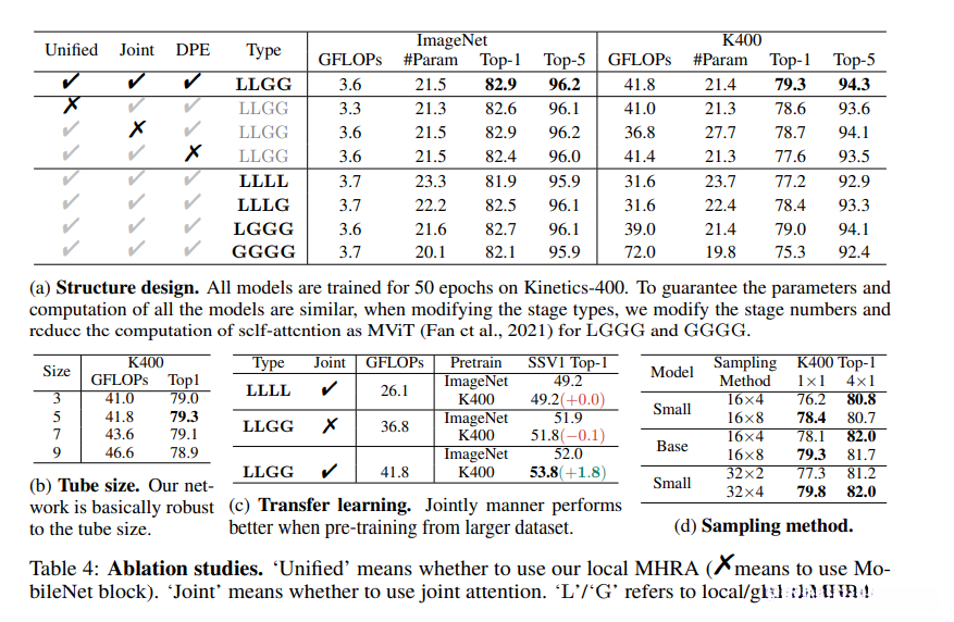 表4(a)第3行:深层的MHRA可以看成是transformer block,但是同时进行时空注意力,而不是分别进行时间和空间注意力。