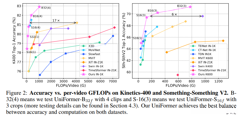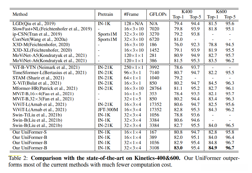 因此,我们将3D卷积和时空自注意力结合在一个简洁的transformer结构中,achieve a preferable balabce between efficiency and effectiveness,在计算量和精确度上达到平衡。