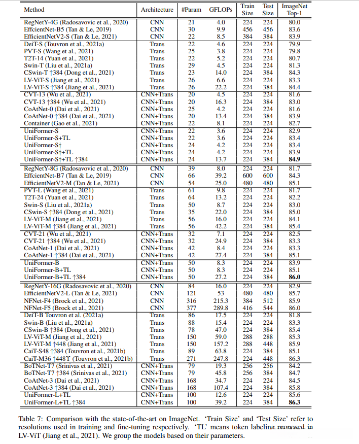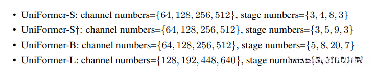 设计了两个变体,在4 stages中的UniFormer block数量分别为: