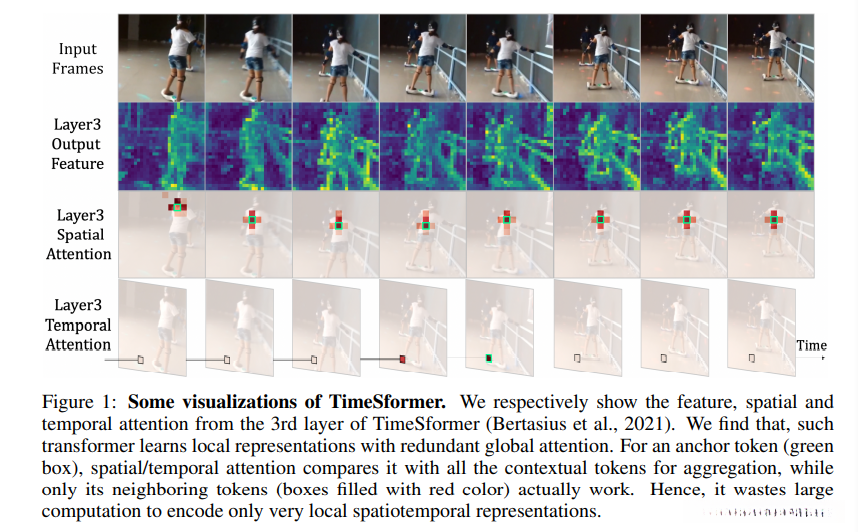 在图1中,TimeSformer在浅层中学习视频信息,但是空间和时间注意力都过于冗余。