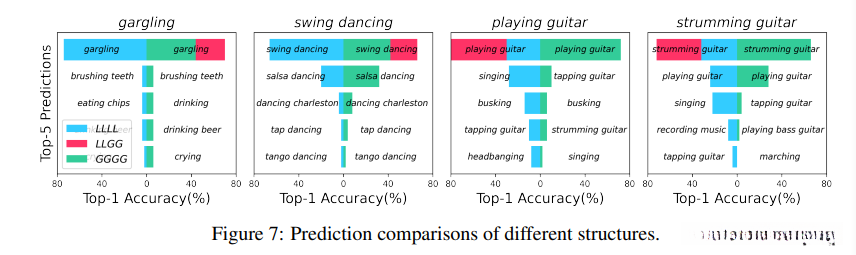 图7 : gargling is often misjudged as brushing teeth, swing dancing is often misjudged as other types of dancing 因为这些类别通常基于空间细节来判断,LLLL效果好于GGGG。