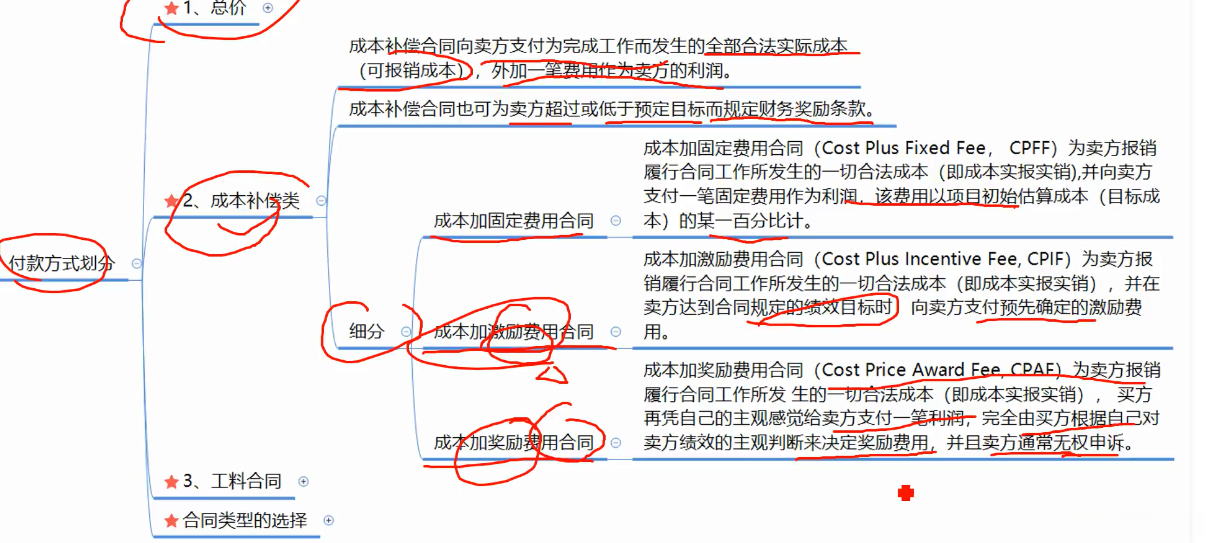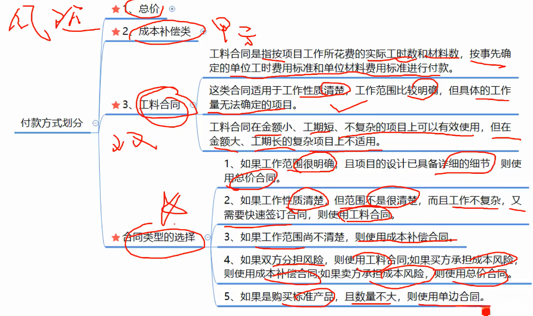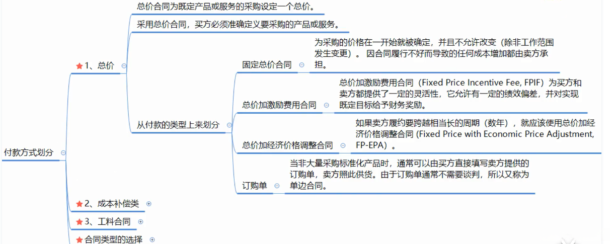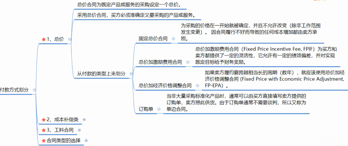 2.也可以按照付款方式来划分,包括总价合同,成本补偿类合同。工料合同。