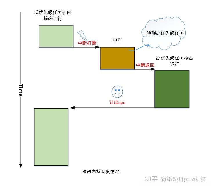 内核的一些路径上配置了一个标志之后,在接下来的一个调度周期内将被触发调度(这可能发生在进程被强行抢占资源时,也可能发生在系统检测到进程出现异常中断时)