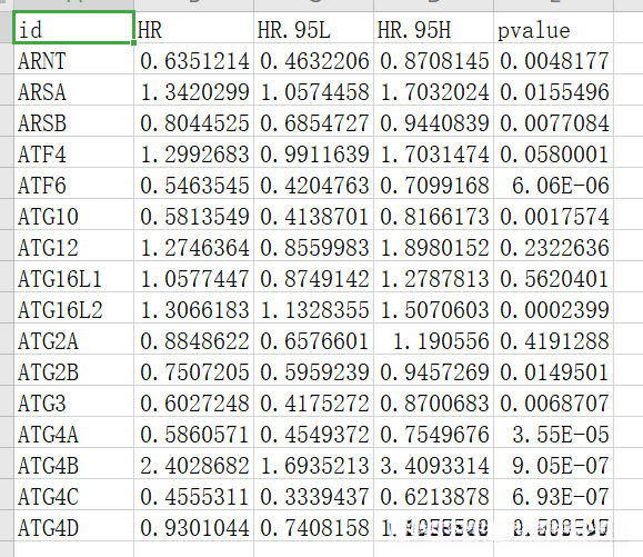 # id HR HR.95L HR.95H pvalue