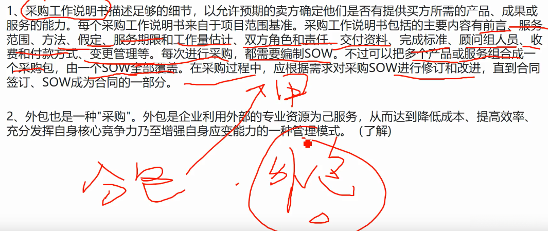 随后,在第二步中提到采购工作说明书时,则会指出该说明书写来源与项目范围基准文件一致。需要采购的具体物品也都是基于项目范围内的需求来确定的。