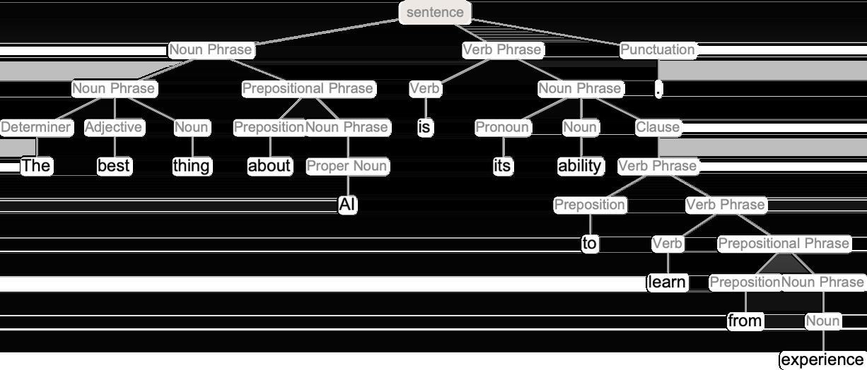 首先是语言的句法。语言不仅仅是随机的单词组合。相反,对于如何将不同种类的词放在一起有(相当)明确的语法规则:例如,在英语中,名词可以放在形容词之前,后面可以跟动词,但通常两个名词不能紧挨着每个名词其他。这种语法结构可以(至少近似地)通过一组规则来捕获,这些规则定义了如何将“解析树”放在一起: