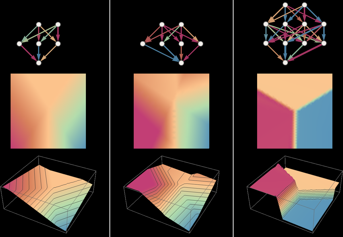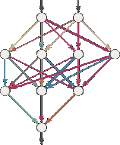 每个“神经元”都被有效地设置为评估一个简单的数值函数。为了“使用”网络,我们只需在顶部输入数字(比如我们的坐标 x 和 y ),然后让每一层上的神经元“评估它们的功能”并通过网络传递结果——最终产生最终结果在底部:
