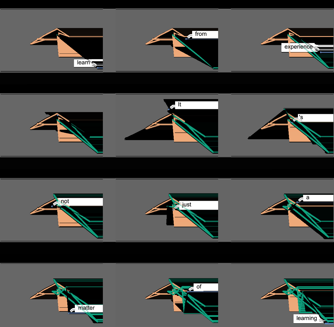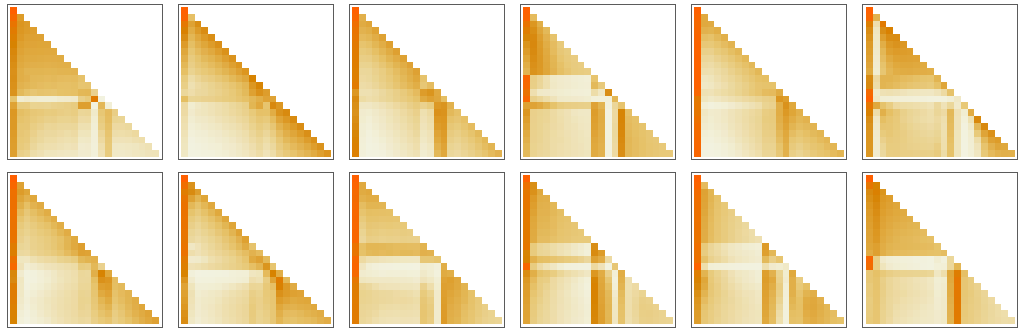 在更详细的层面上,注意力头所做的是重新组合与不同标记相关联的嵌入向量中的块,具有一定的权重。因此,例如,第一个注意力块(在 GPT-2 中)中的 12 个注意力头具有以下内容(“look-back-all-the-way-to-the-beginning-of-the-sequence-of- tokens)上面的“ hello , bye ”字符串的“重组权重”模式: