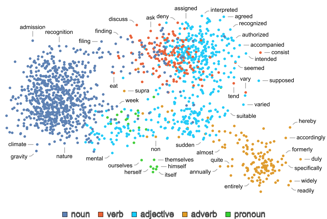 那么这个语言特征空间是什么样的呢?下面是一个示例,说明如果我们将这样的特征空间投影到 2D,单个单词(这里是普通名词)可能会如何布局: