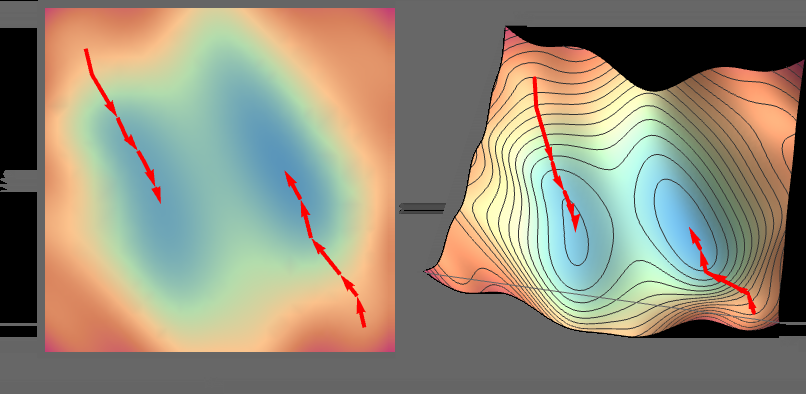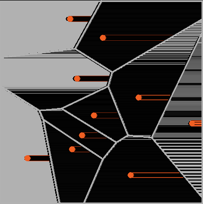 作为一个简单的类比,假设我们在平面上有某些位置,用点表示(在现实生活中,它们可能是咖啡店的位置)。然后我们可能会想象,从飞机上的任何一点开始,我们总是希望在最近的点结束(即我们总是去最近的咖啡店)。我们可以通过将平面划分为由理想化的“分水岭”分隔的区域(“吸引盆地”)来表示: