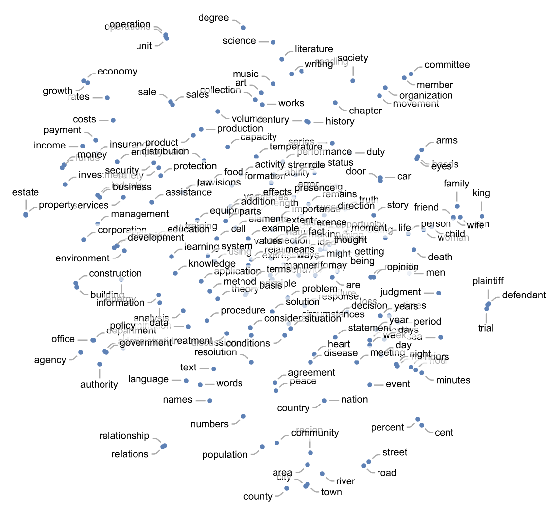 我们在上面看到了另一个基于代表植物和动物的词的例子。但这两种情况的要点是“语义相似的词”被放置在附近。