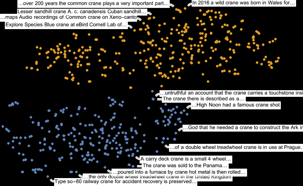 当然,一个给定的词通常并不只有“一个意思”(或者必然只对应一个词性)。通过查看包含一个词的句子如何在特征空间中布局,人们通常可以“梳理”不同的含义——就像这里的例子中的单词“crane”(鸟还是机器?):