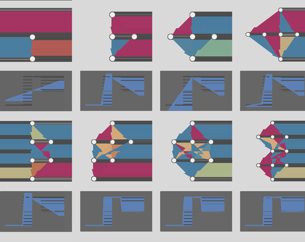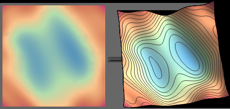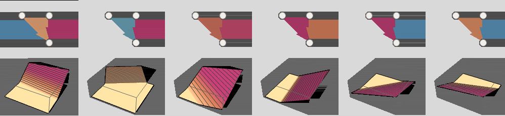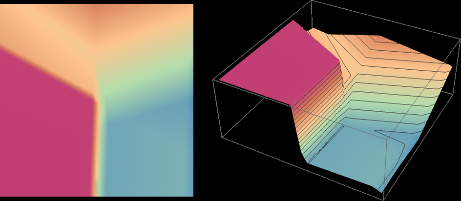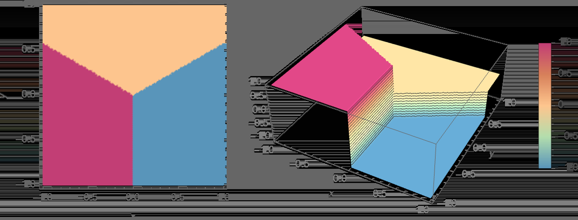 但是让我们回到单个神经元。 以下是具有两个输入(表示坐标x 和 y )的神经元可以使用各种权重和常数(以及Ramp作为激活函数)进行计算的函数示例: