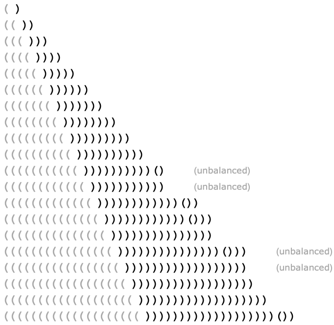 在第一种情况下,网络“非常确定”序列不能在此处结束——这很好,因为如果结束了,括号就会变得不平衡。然而,在第二种情况下,它“正确识别”序列可以在这里结束,尽管它也“指出”可以“重新开始”,在后面放一个“(”,大概是一个“)” . 但是,哎呀,即使有大约 400,000 个经过艰苦训练的权重,它仍然说有 15% 的概率将“)”作为下一个标记——这是不对的,因为这必然会导致括号不平衡。