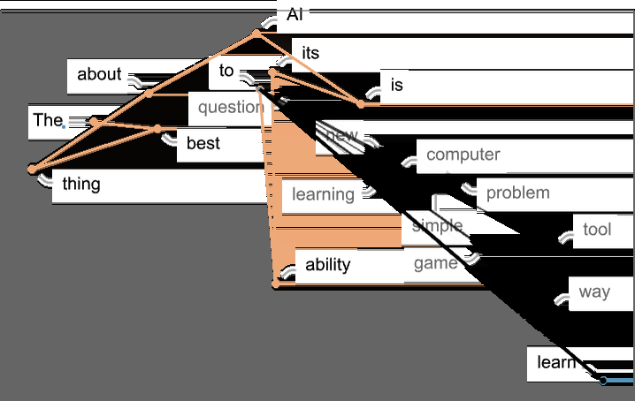 稍后,我们将深入了解这个神经网络,并讨论它是如何工作的。但是现在我们可以将这个“网络模型”作为一个黑盒子应用到我们的文本中,并按模型说应该遵循的概率要求前 5 个词: