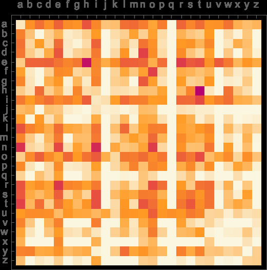 这是一个图表,显示了典型英文文本中字母对(“2-grams”)的概率。可能的第一个字母显示在整个页面上,第二个字母显示在页面下方:
