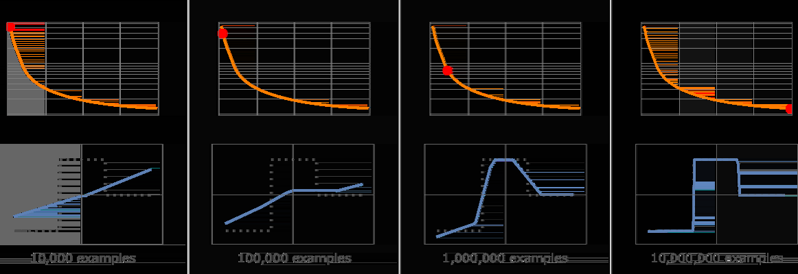 即使在我们之前讨论过的看似简单的学习数值函数的案例中,我们也发现我们经常必须使用数百万个示例才能成功训练网络,至少是从头开始。那么这意味着我们需要多少示例才能训练“类人语言”模型?似乎没有任何基本的“理论”方法可以知道。但在实践中,ChatGPT 成功地训练了数千亿字的文本。