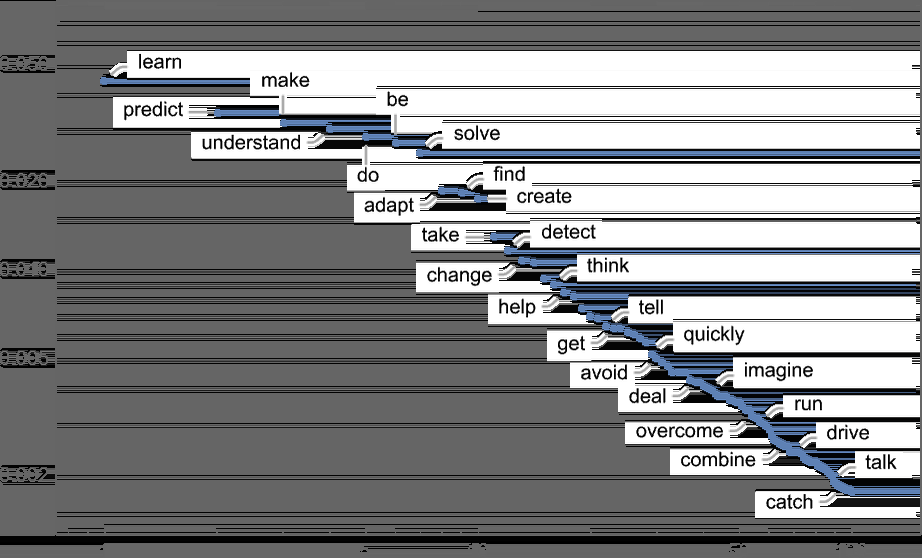 我们在这种情况下看到的是,有一个高概率词的“扇形”似乎在特征空间中或多或少地朝着确定的方向移动。如果我们走得更远会发生什么?以下是我们“沿着”轨迹“移动”时出现的连续“扇形”:
