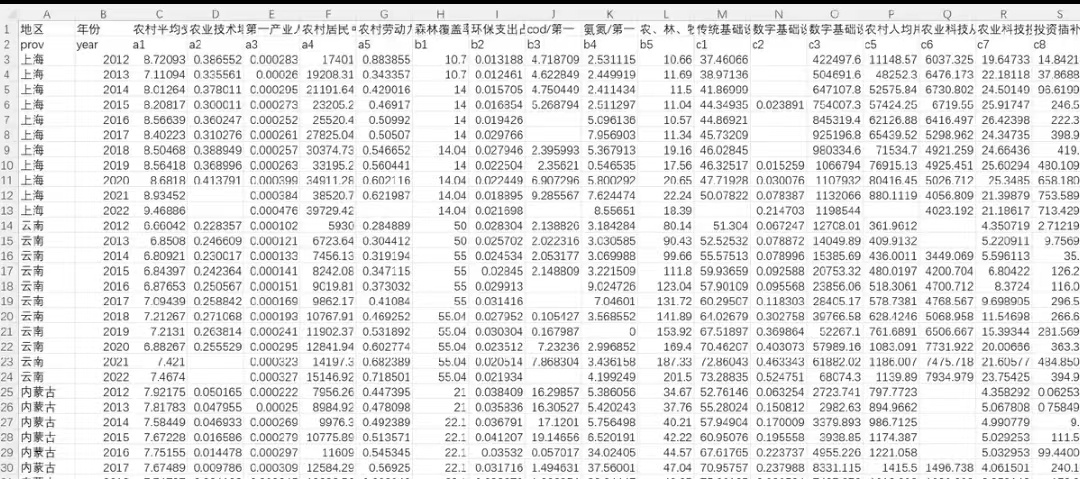 注:由于数据收集难度问题,本数据集不包含农业专业化国家重点龙头企业数量这一变量。本数据集用总产值增长指数_农、林、牧、渔(上年=100)来代替指标体系中的农林牧渔服务业增加值。