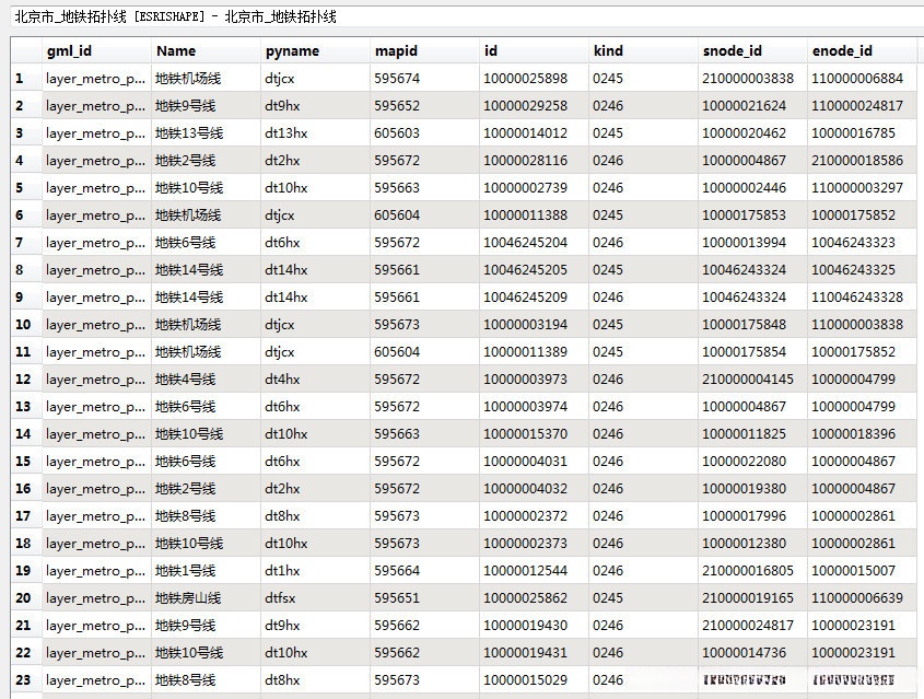 北京市轨道交通线网数据由三个组成部分构成:地铁实际线路、地铁拓扑线路以及地铁站点数据表;其中所有数据均以 .SHP 文件格式存在,并基于WGS1984地理坐标系统进行存储。该三套数据分别配有相应的属性表信息,请参考 accompanying figure 以了解具体包括哪些字段;获取途径可通过访问链接 https://data.yunshudu.com/detail.html?id=10049 获取;联系人:李明(QQ:3611336893)