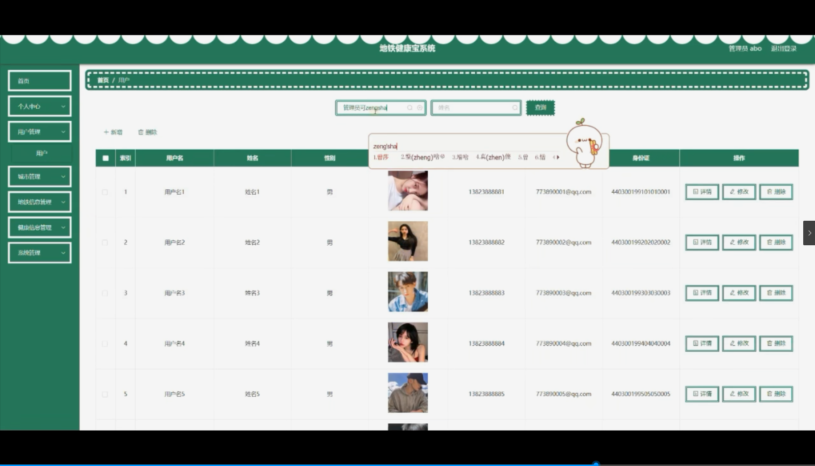 地铁健康宝系统旨在整合多方面的信息以提升地铁的健康管理水平。首先,在用户方面,系统要能够实现用户的注册、登录,以及对用户健康信息(如健康码状态、基本健康状况等)的采集与管理。这部分功能可以方便地铁运营方及时掌握乘客的健康情况,以便在特殊情况下采取相应的措施。其次,关于城市信息,系统要接入城市的环境数据,如空气质量、气象信息等,因为这些因素会影响地铁内的环境健康状况,例如空气质量差可能需要加强地铁通风系统的运行。再者,对于地铁信息,要涵盖地铁的运营状况(如客流量、列车运行状态等)、设施设备的健康状态(如通风设备、扶手电梯等设备的运行参数)等内容,以便及时发现潜在的安全和健康隐患。最后,健康信息的整合是核心功能之一,系统要能够对收集到的各类信息进行综合分析,例如根据用户健康信息、城市环境信息和地铁运营信息,预测在地铁环境中可能出现的健康风险,如传染病传播风险、因客流量大导致的缺氧风险等,并提供相应的预警和应对建议。通过这些研究内容的实现,构建一个全面、高效的地铁健康宝系统。