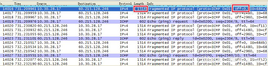 - 查看第一个ICMP请求包(其info部分包含request字段)的Fragment offset值。