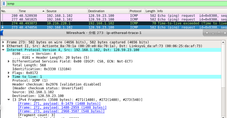- 查看最终一条(按时间排序)ICMP响应包(info部分包含reply字段),确定此回应数据被分割成几片。