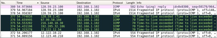查看首次返回超时路由的信息(由于这些报文具有生存时间)。我们观察到存活时间为 TTL=63,并且其中 ID 字段值显示为 15173: