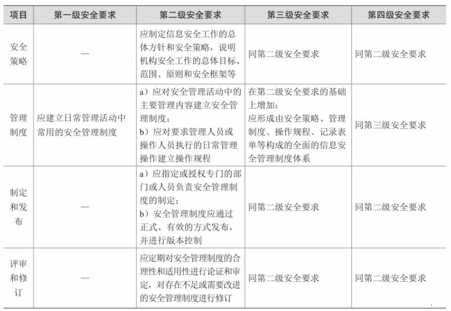 依据GB/T 22239-2019《信息安全技术 网络安全等级保护基本要求》,安全管理制度相关规范规定如下表所示。