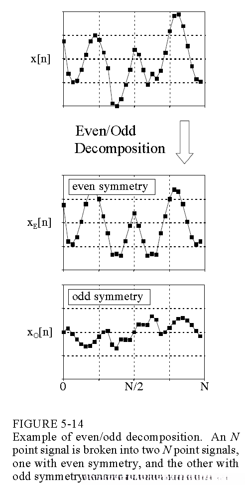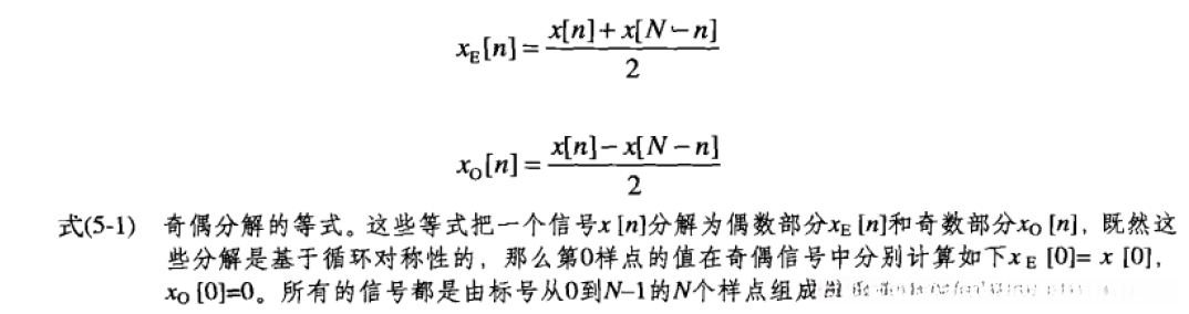 奇偶分解主要指将一个包含N个单位长度的原始信号进行分解处理,具体表现为将其分为两份:一份是与原序列等长且具有奇镜像特性的"奇分量",另一份则是与原序列等长并呈现偶镜像特性的"偶分量".值得注意的是,该过程实际上是对原始序列进行了延拓处理,使其时域长度得以从原本的N增长到2倍即2N.具体而言,对于任何一个包含有N个采样点的数据序列x[n],当其在以第(N/2)个采样点为中心左右两侧呈现出完全镜像对齐的状态(即关于Y轴呈镜像分布),我们便将其定义为偶分量序列Xe[n].反之,若该序列在以第(N/2)个采样点为中心左右两侧呈现出围绕该点呈中心翻转的状态(即关于中间点呈现中心翻转),则我们将其定义为奇分量序列Xo[n].