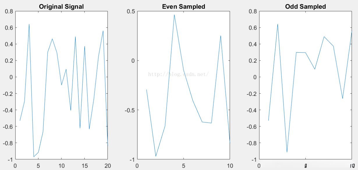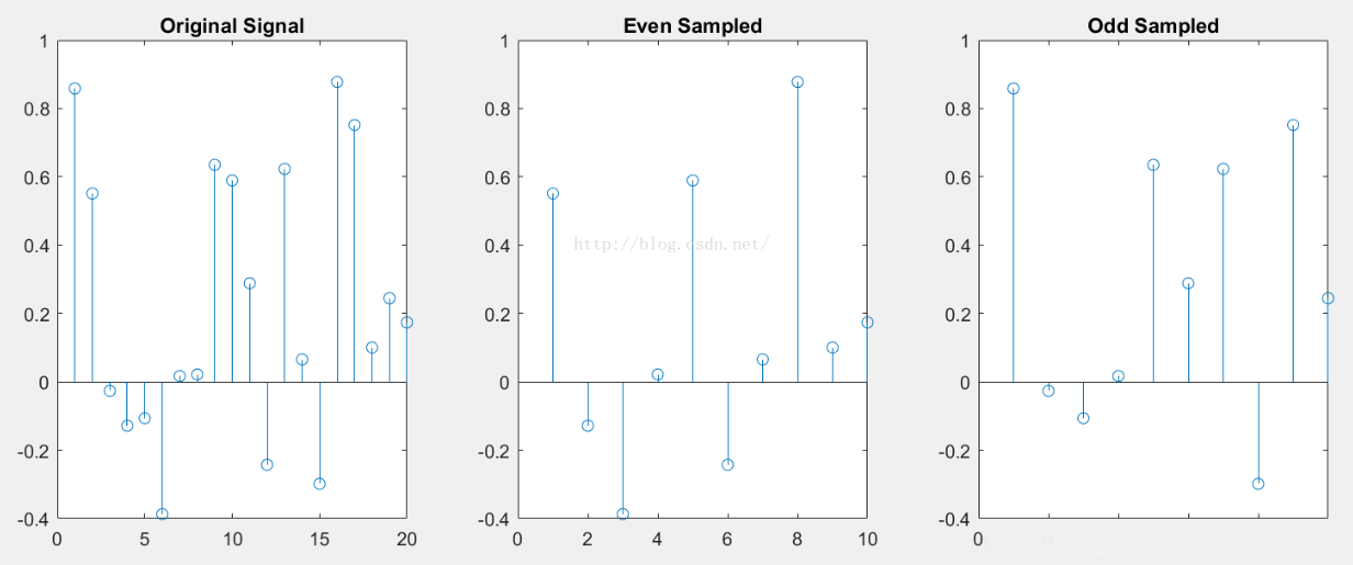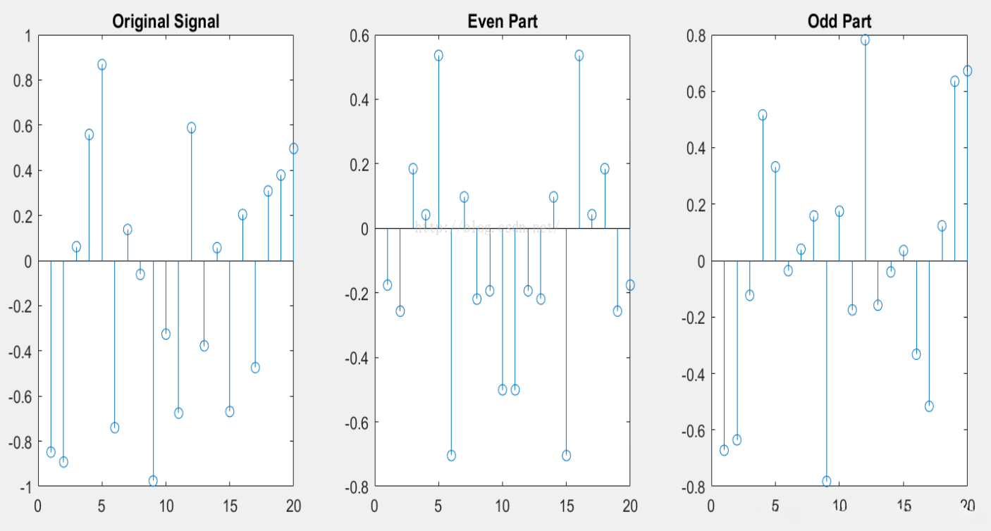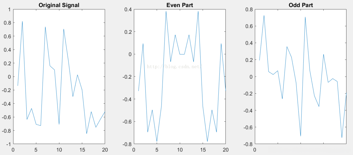 这是我用Matlab仿真的离散随机信号和它的奇偶分解。