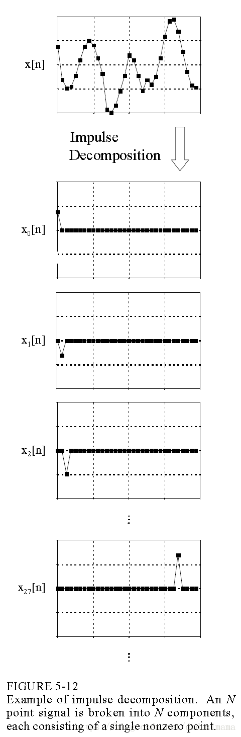 该方法通过信号采样将其分解,并实现了连续时间信号的离散化过程,在构建线性时不变系统方面发挥了显著作用。如图所示,在同一个长度为N的信号中被分解为位置各异、大小各异的一组N个点类(这些点类类似于一个个具有大小和方向矢量)。该方法是卷积运算的基础支撑。