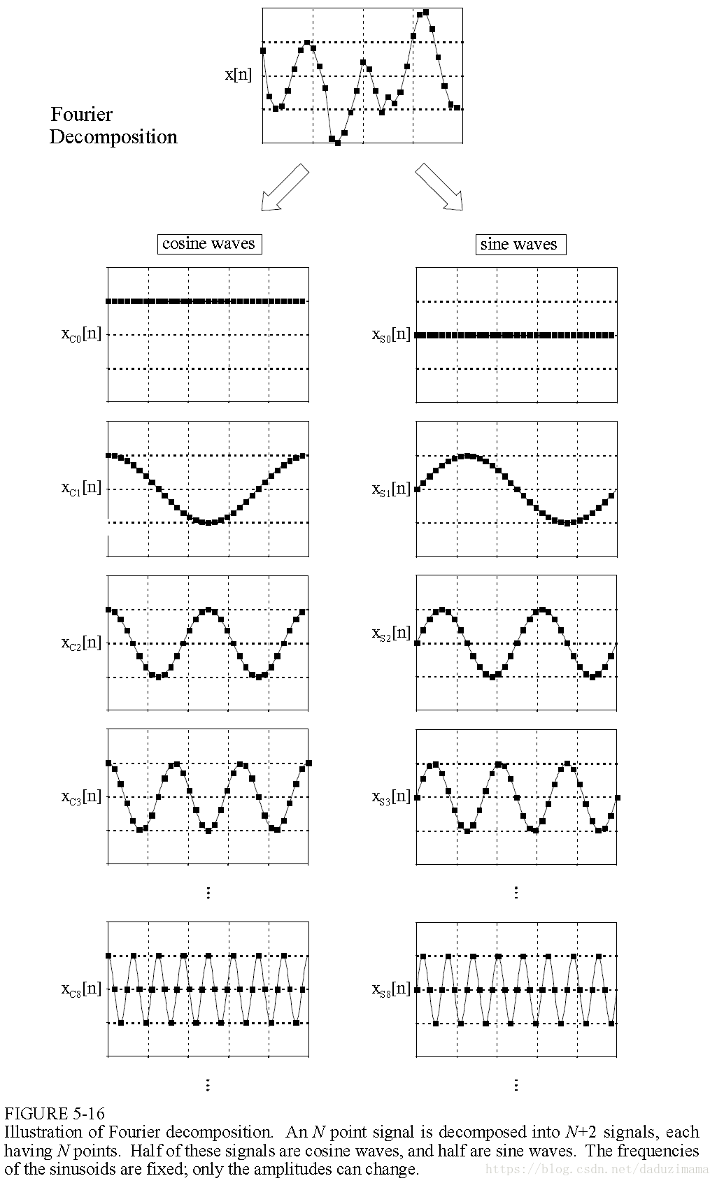 任何一点信号都可以分为N+2个部分:其中一部分由不同频率的正弦波构成;另一部分则由不同频率的余弦波构成。