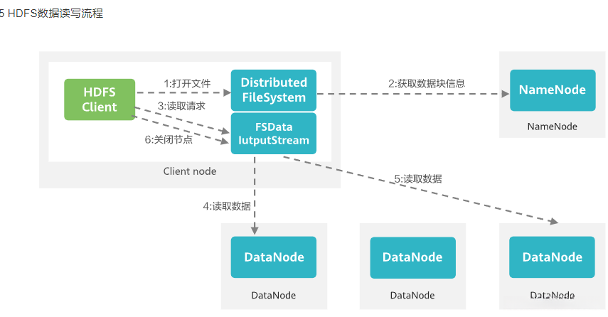 数据读取流程: 1.打开文件 -> 2.获取数据块信息 -> 3.读取请求 -> 4.读取数据 -> 5.读取数据 -> 6.关闭节点