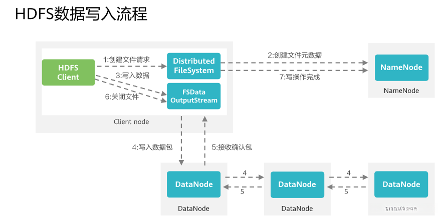 数据写入流程: 1.创建请求 -> 2.创建文件元数据 ->3.写入数据 -> 4. 写入数据包 -> 5.接收确认包 -> 6.关闭文件 ->7.写操作完成