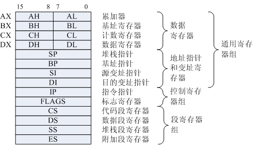 - 通用数据寄存器:AX、BX、CX、DX(16位),可分解为AH/AL等高位低位寄存器。
