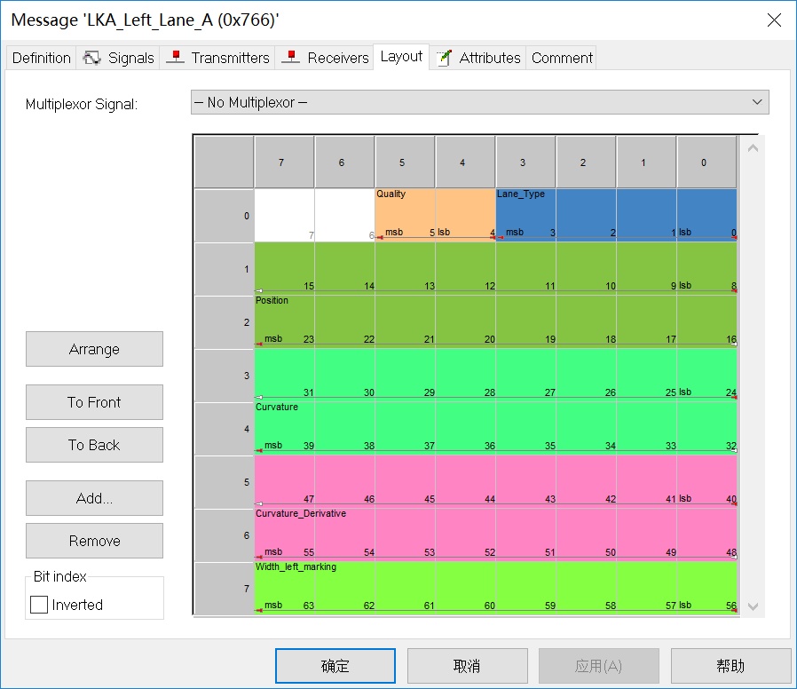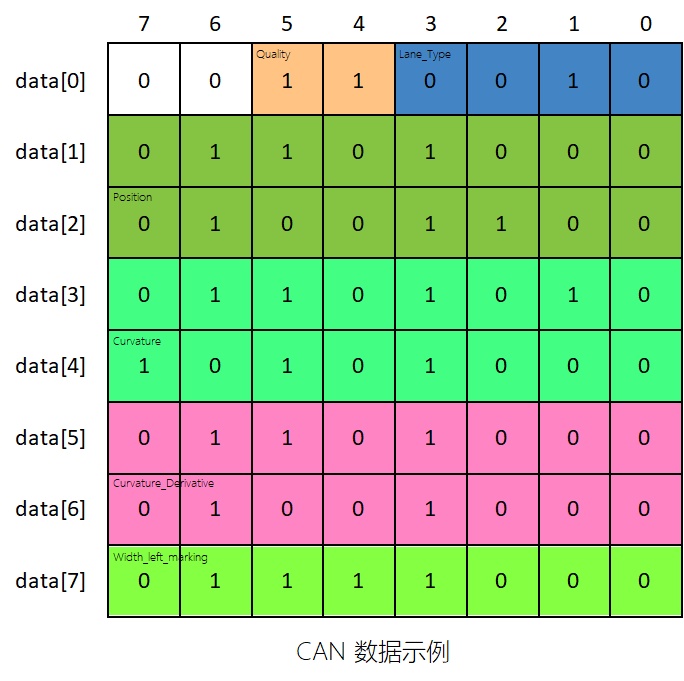 通过图形直观地可以看出, Quality这个信号占用两位二定位于, 其对应的二值编码为5, 换算后得到十值编码5; 而Lane_Type则占用了四位码定位, 其对应的四值编码表示为6, 计算得到最终的八值编码6.